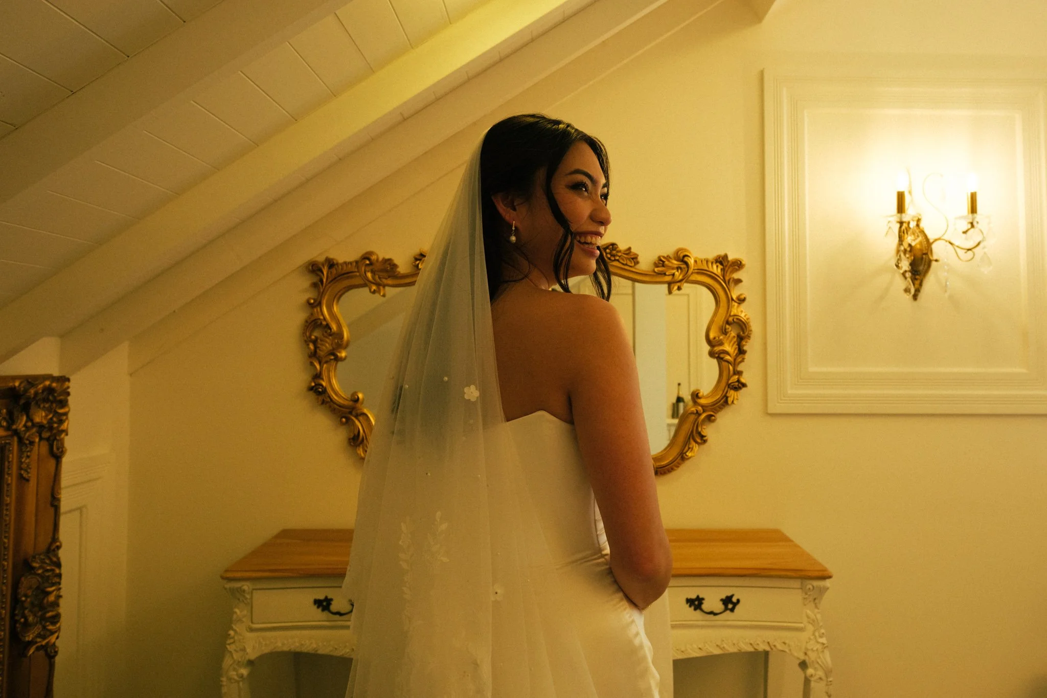 One of my favourite shots from the day — I just love the ornate detail on the mirror, and the classic reflection shot. In this frame, Charisse’s sister Ina assists her with her veil.